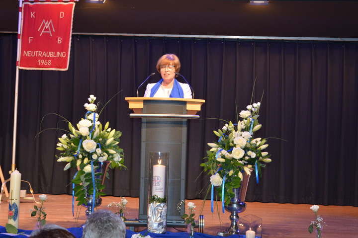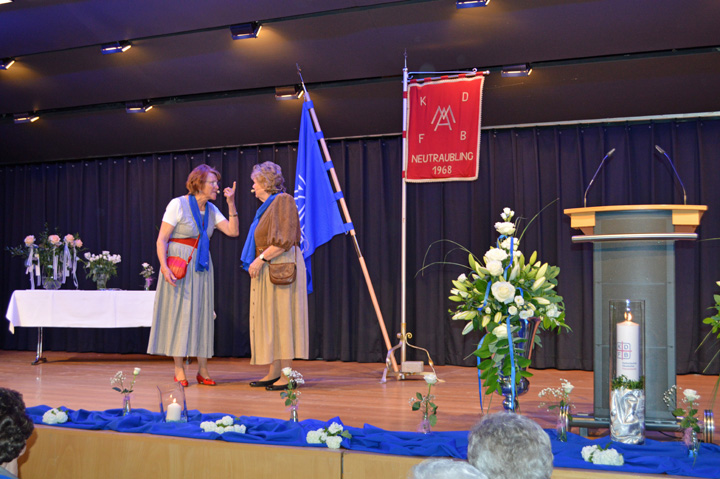Mit einem Sketch über die ersten Jahre im Zweigverein Neutraubling amüsierten Margot Gabriel und Erika Winkler in der festlich geschmückten Stadthalle gleich zu Beginn die zahlreichen Gäste. Bevor jedoch der Festakt begann, konnten sich alle Gäste am Buffet bedienen. Monika Schantl, Sprecherin des Führungskreises, begrüßte alle Anwesenden, insbesondere Pater Dr. Jakob Seitz, Pfarrer Josef Weindl, Monsignore Ludwig Gradl und Pfarrer Max Rabl und bedankte sich bei ihnen mit einer Rose für den schönen Jubiläumsgottesdienst. Sie freute sich auch über die Teilnahme von Bezirksvorsitzender Edith Hüttinger und Bürgermeister Heinz Kiechle und hieß beide herzlich willkommen. Ganz besonders begrüßte sie alle Jubilarinnen, die an diesem Abend geehrt wurden.