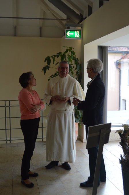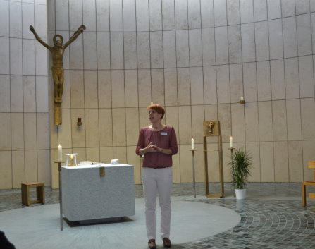 Bevor zusammen eine Hl. Messe gefeiert wurde, war eine Kirchenführung anberaumt. Michaela Schmid von der Heimleitung beschrieb die Entstehung von Schloss Spindlhof bis zur jetzigen Nutzung als Seminarhaus. Der Aufbau der 2004 gebauten Albertus-Magnus-Kirche greift die 4 Elemente auf: Wasser, Erde, Luft und Feuer. Das bronzene Jesuskreuz hinter dem Altar zeigt nicht den Gekreuzigten, sondern den Auferstehenden. Anhand der eindrucksvollen Schilderung von Frau Schmid wurde man sich der Bedeutung dieser Kirche erst bewusst.