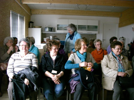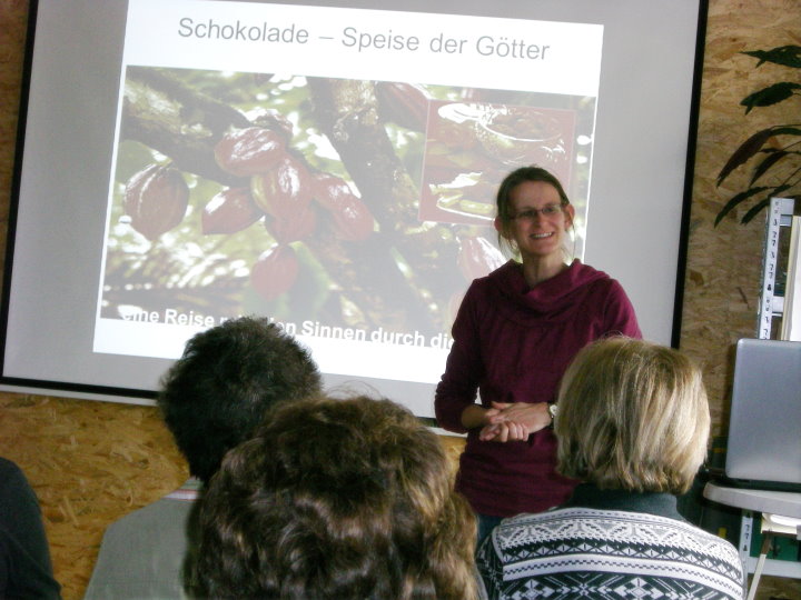 Aufmerksam lauschten die Teilnehmer dem Vortrag von Myriam Mainz über die Schokolade: von der Entdeckung und dem Anbau der Kakaobohnen bis hin zu der guten Schokolade, wie wir sie kennen. Der Preis der Kakaobohnen richtet sich nach der Börse und die Kleinbauern erhalten von den Zwischenhändlern oft nur die Hälfte des Weltmarktpreises. Damit diese Kleinbauern überleben können und auch sozial abgesichert sind, legt der faire Handel einen Mindestpreis fest. Zudem erhalten die Kleinbauern eine Fair-Trade-Prämie von derzeit 200 US-Dollar pro Tonne Rohkakao. Wenn der Weltmarktpreis für Rohkakao über dem Fair-Trade-Mindestpreis liegt, so wird auch im Fairen Handel dieser höhere Weltmarktpreis bezahlt, zuzüglich der Fair-Trade-Prämie. Schon allein daher kann man nachvollziehen, warum fair gehandelte Schokolade etwas teuerer ist als „normale“ Schokolade, andere Faktoren kommen noch hinzu.