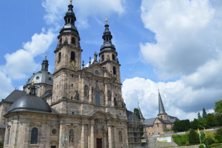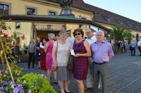 Gleich bei der Ankunft kamen die Teilnehmer in den Genuss einer Orgel-Matinee im Dom St. Salvator mit Gastorganist Stefano Manfredini aus Bologna. Als Grabeskirche des Hl. Bonifatius, der in der Stadt immer wieder präsent ist, gilt der Dom als Wahrzeichen der Stadt und bildet den Mittelpunkt des Barockviertels. Der weiße Innenraum mit vielen Stuckierungen greift Elemente des Petersdoms auf, wie bei der anschließenden Führung zu erfahren war. Es war ein Spaziergang – begleitet von vielen Informationen und Anekdoten - vorbei am Hexenturm durch die Altstadt bis zum Hotel, das sehr zentral lag. Die Zeit bis zum gemeinsamen Abendessen nutzten daher noch viele, um selbst die Stadt zu erkunden. Gestylt und in freudiger Erwartung trafen sich alle beim Schlosstheater, das nur 2 Gehminuten vom Hotel entfernt war und sahen der Aufführung mit Spannung und Erwartung entgegen.