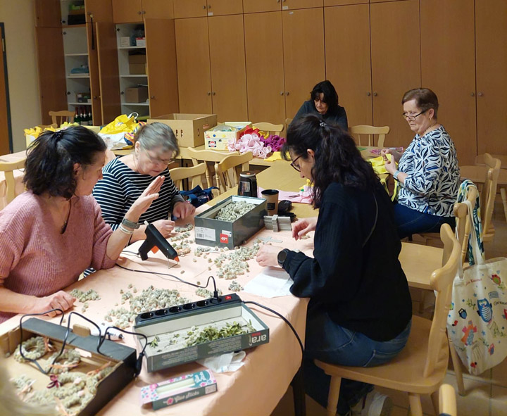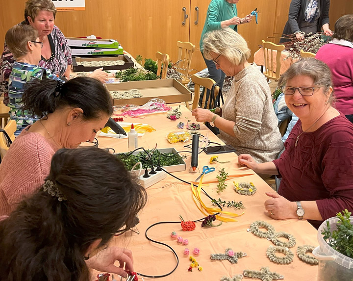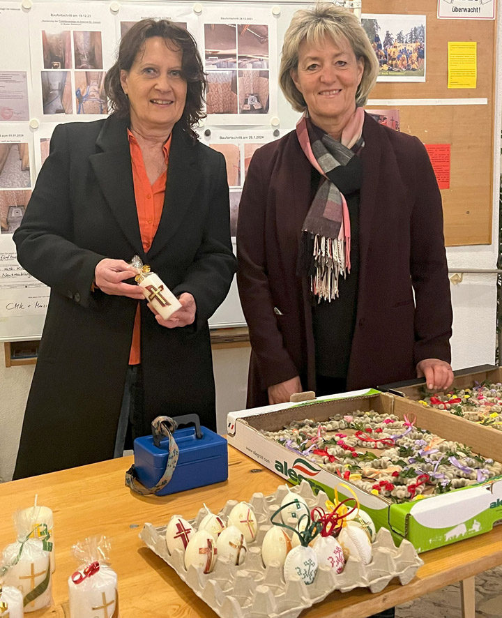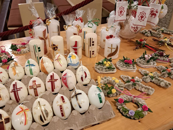 Sehr fleißig waren in den Wochen vor Ostern wieder 11 Damen der Frauengruppe St. Michael. Wie jedes Jahr trafen sie sich mehrmals zum Basteln im Pfarrsaal. Ein eingespieltes Team, unterstützt von immer wieder neuen Helferinnen, fertigten aus Palmkätzchen, Buchsbaum und Krepppapier verschiedene traditionelle Palmbüscherl, -kränzchen und -kreuze, die alle am Wochenende vor Palmsonntag verkauft wurden. Auch handverzierte Osterkerzen, bestickte Eier und Fähnchen, in liebevoller Heimarbeit hergestellt, wurden zum Verkauf angeboten und fanden regen Absatz. Der Erlös geht an die KUNO Siftung für Forschung der Kinderonkologie Regensburg.