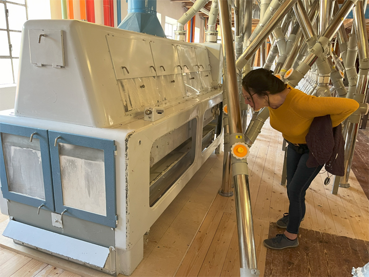 Am Freitag, den 12.04. haben wir zusammen mit 15 Besuchern eine Führung in der Poschenrieder Mühle durchgeführt und somit einen Einblick in die Arbeit der traditionellen Handwerksmühle bekommen. Aber eigentlich hat die Müllerin Andrea Ramsauer gar keine Zeit. Sie arbeitet in einem harten Gewerbe, in dem sie sich Tag für Tag behaupten muss, um nicht von den Großen verdrängt zu werden. Romantisches Müllerleben gibt es hier nicht im Angebot aber viel Herzblut und Leidenschaft für ihre Mühle durchaus. Heute ist die Poschenrieder Mühle in Bruckdorf eine der wenigen, die das Mühlensterben überlebt hat. Die Anforderungen sind hoch und heute hat das Labor eine Schlüsselposition in der Mühle. Dort wird die Qualität des angelieferten Getreides mehrmals geprüft und gereinigt, sowie das verarbeitete Mehl während der Produktion kontrolliert und zugleich die Qualität des fertigen Mehlprodukts überwacht, bevor es die Mühle verlässt.
