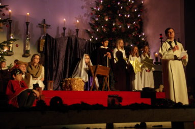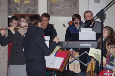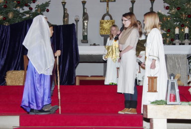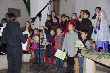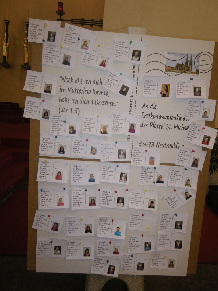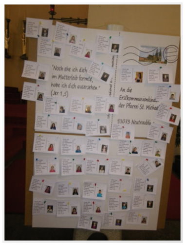 Im Mittelpunkt des Gottesdienstes, welcher vom Kinderchor musikalisch umrahmt wurde, stand die Berufung des Propheten Jeremia durch Gott, vor die Völker zu treten und ihnen zu verkünden, was Gott ihm aufgetragen hat. Doch Jeremia hat Angst, den Auftrag Gottes nicht erfüllen zu können; er fühlt sich zu jung, zu unerfahren. Doch Gott macht ihm Mut. Er ruft ihm zu: „Noch ehe ich dich im Mutterleib formte, habe ich dich ausersehen.“ Pastoralassistent Manuel Hirschberger versuchte nach der Lesung, den Erstkommunionkindern zu erklären, wie man das alte Wort „ausersehen“ in unsere Zeit übersetzen könnte. „Ausersehen“ könne heißen, dass Gott jeden von uns erwählt habe, sein Sohn/seine Tochter zu sein; Gott habe mit jedem Menschen seinen Plan. Dies habe er nicht nur dem Jeremia damals zugesagt, sondern er rufe es jedem von uns auch heute zu: „Du bist was Besonderes! Du kannst was! Ich war doch schon bei dir und habe an dich gedacht, also du noch im Leib deiner Mutter warst.“ Diese Aussage, so Hirschberger, gelte besonders für die Erstkommunionkinder, die in diesem Jahr von Gott ganz besonders gerufen seien: nämlich zum Mahl mit Jesus. Nachdem die Erstkommunionkinder von ihren Tischmüttern aufgerufen worden waren, hefteten sie die Aussage des Jeremia mit ihrem Foto an eine große, von Gott abgeschickte „Postkarte“.