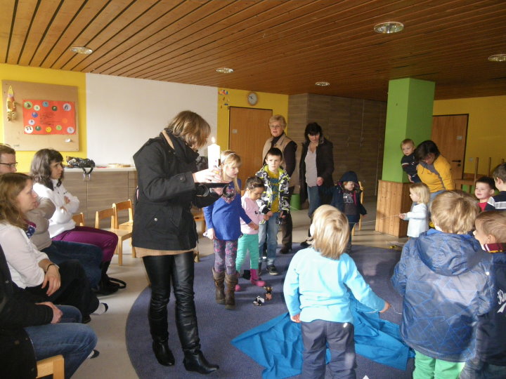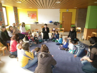 Die Kinder beschäftigten sich mit den Eigenschaften des Namenspatrons ihrer Kirche. Michael – ein Engel voller Stärke, noch dazu mit einem Speer in der Hand? Zwangsläufig denkt man da zuerst an Überlegenheit, vielleicht sogar Kampf. Doch hat Gott seinen Engel dafür geschickt? Die Antwort darauf fanden die Kinder in der Kinderkirche. Sie wurden „entführt“ in eine Stadt, in der die Menschen nur an sich dachten und ihr gutes Leben in vollen Zügen genossen – bis es Gott zu bunt wurde. „Michael, sieh an diese Menschen und führe sie an Orte, wo sie wirklich stark und gut sein können!“ In einer gemeinsam gespielten Geschichte mit Requisiten, Instrumenten und Personen erlebten die Kinder, dass Stärke und Kraft und sogar ein Speer an sich etwas Positives sind – wenn man es für diejenigen einsetzt, die Schutz und Hilfe brauchen und es im Leben besonders schwer haben. So lernten sie zum Beispiel Engel Michael als jemanden kennen, der mit dem Schwert Holz spaltete, um für einen Lahmen eine Trage zu bauen. Die Geschichte spielte plötzlich weiter in ihrem Kindergarten, in ihrer Schule. Es fiel den Kindern nicht schwer, auch dort Menschen beziehungsweise Beispiele zu finden, wo Hilfe nötig ist. Mit einem Liedruf „Wenn ich bin wie St. Michael, so mutig und so stark . . . “ zogen die Kinder zur Kirche und feierten mit der Gemeinde das Patrozinium im feierlichen Gottesdienst weiter.