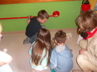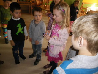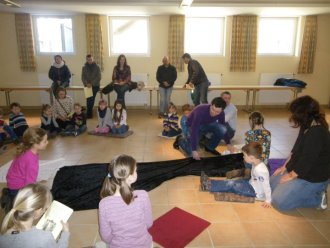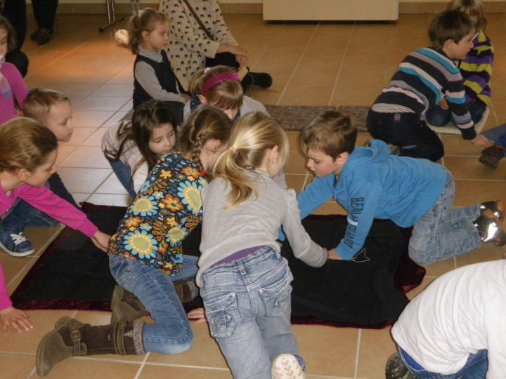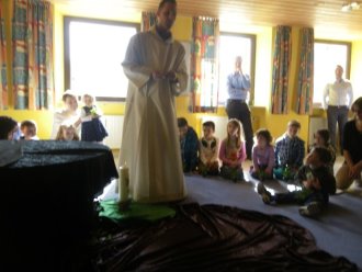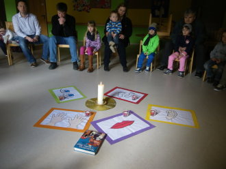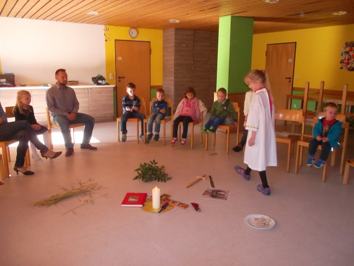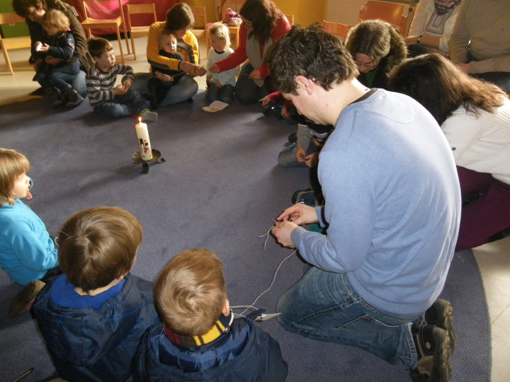 Als Einstimmung in das Tagesevangelium ward jedes Kind beim Namen gerufen und versammelte sich um eine Mitte. Dort verknüpften sie sich mittels Bändern zu einer Gemeinschaft. Im gemeinsam gespielten Evangelium hörten sie von Jesus, der auch nicht allein unterwegs sein wollte und Menschen gerufen hat, ihm zu folgen, so auch die Fischer Simon und Andreas. Miteinander fanden die Kinder heraus, dass auch sie gerufen und eingeladen sind, andere für Gott zu begeistern. Symbolisch folgte jedes Kind der Jesuskerze und nahm ein anderes Kind mit auf den Weg in die Gemeinschaft.