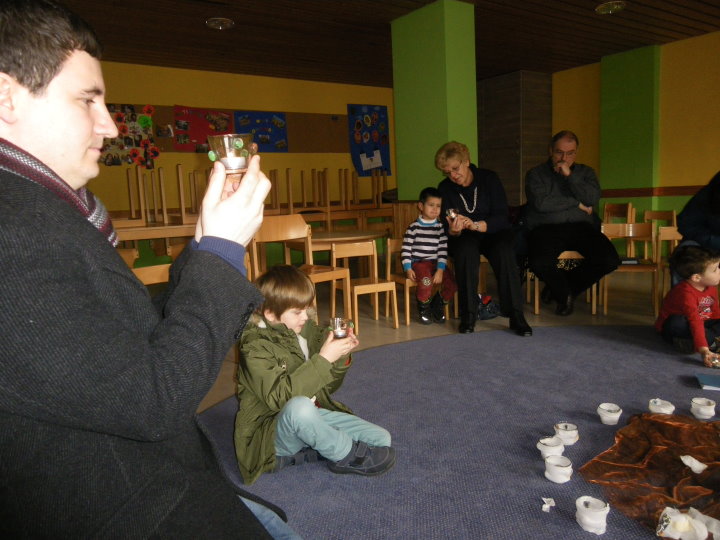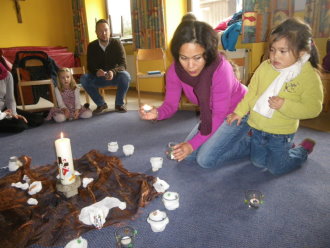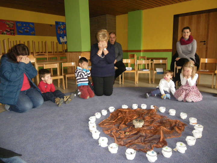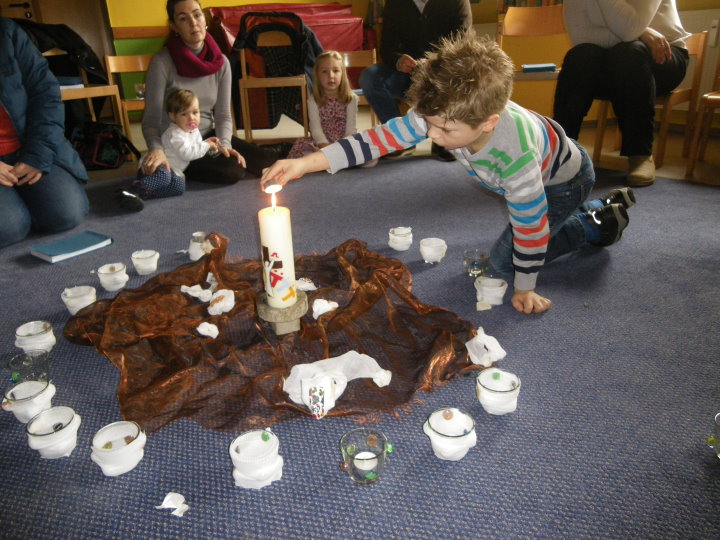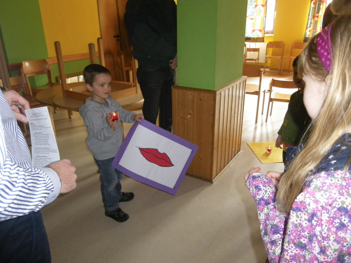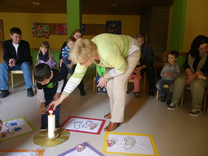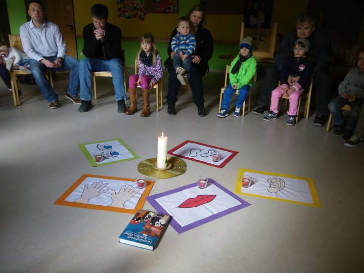 Jesus hat gesehen, dass wir vieles noch nicht schaffen. In einer Art Memoryspiel deckten die Kinder Beispiele auf, wo unsere Hände, Augen, Nase, Ohren, Mund nicht zum Guten genutzt werden. Bei jedem Sinn ward deshalb eine Kerze gelöscht. Und jetzt? Durch unsere Gemeinheit und Bosheit waren alle Lichter ausgegangen. Wir saßen im Dunkeln. Half dagegen ein Streichholz? Die Kinder probierten es mit ihren Eltern aus. Es funktionierte weder das Streichholz noch konnte es unser Verhalten verwandeln. Hilflos saßen wir da. Plötzlich vernahmen wir einen Liedruf: "Jesu Licht, gib mir Kraft, wo es mir noch Mühe macht." Hoffnungsvoll kehrten wir zur Jesuskerze zurück und hörten aus der Bibel, was Jesus zur Dunkelheit sagt: "Wer das Gute tut, kommt zum Licht." In kleinen Geschichten entdeckten wir schließlich miteinander, die Sinne zum Wohle anderer einzusetzen.