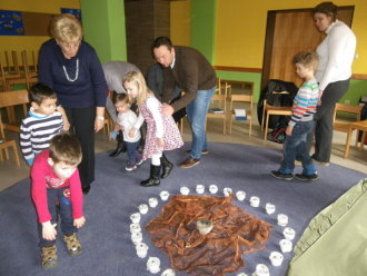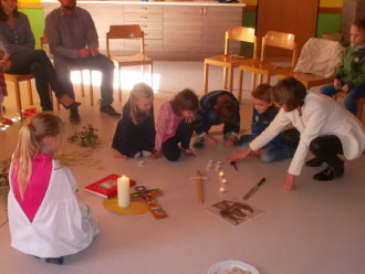 Sie hörten von zehn Menschen mit einer ansteckenden Krankheit, dem Aussatz: Zunächst galt es, sich unter dieser Krankheit etwas vorstellen zu können, und vor allem, wie sie das Leben dieser Menschen beeinträchtigt. Das spürten wir in einem Spiel nach. Aussatz macht hässlich, schwach und zeigt sich durch dicke Beulen am Körper. Demzufolge versteckten wir uns, humpelten, lagen hilflos herum. Jedes Kind bekam ein mit Steinen beklebtes Glas zum "Beulen fühlen". Mit einem Pflaster durften sie einen Verband um diese Beulen wickeln. Damit waren die Aussätzigen für alle als ansteckend erkennbar. Schlimmer als die äußeren Beeinträchtigungen war das Ausgegrenzt sein, hilflos am Rand sitzen, nirgendwo mehr dazu zugehören. Im Evangelium hörten die Kinder, wie Jesus trotz aller Warnungen auf die Unerwünschten zugeht und ihnen Aufmerksamkeit schenkt. Das ist für sie so überwältigend, dass die Krankheit keine Rolle mehr spielt. Ihr Glaube hat ihnen geholfen. Symbolisch entfernten die Kinder die nun nicht mehr benötigten Verbände von den Beulen, entzündeten jeweils ein Teelicht an der Jesuskerze und stellten es mit einem Liedruf in ihr Gläschen. Der Glaube, das Vertrauen auf Jesus, verändert und bringt alles zum Leuchten.