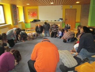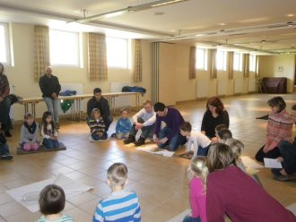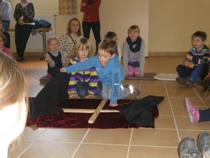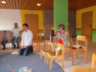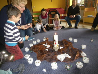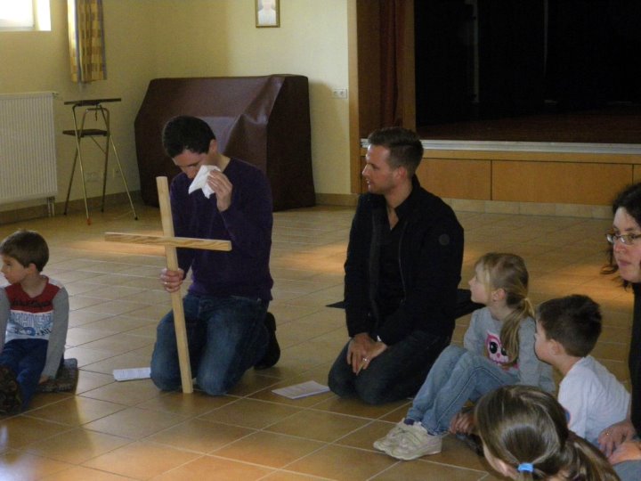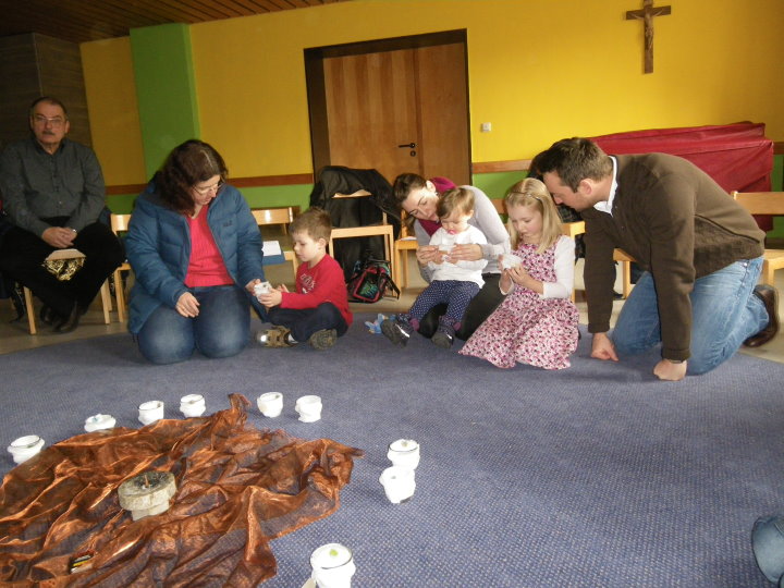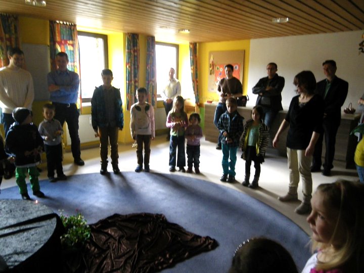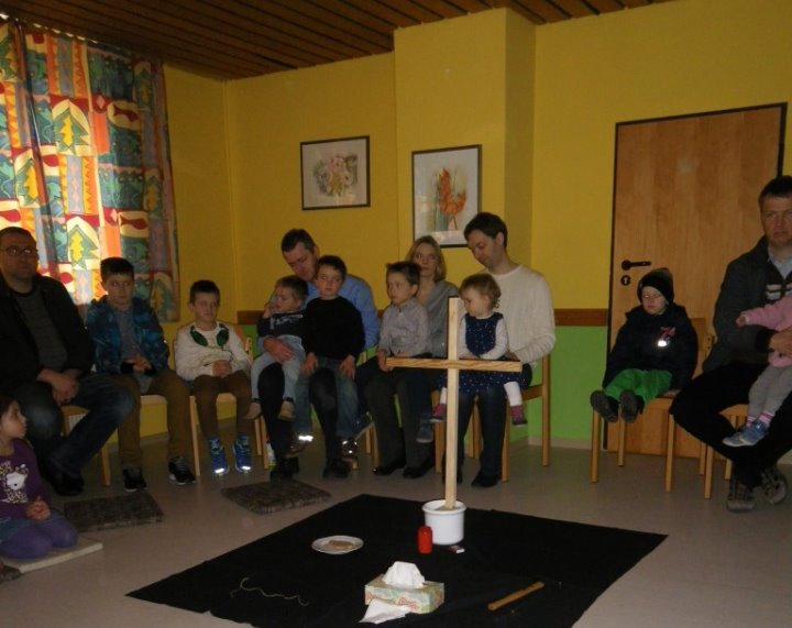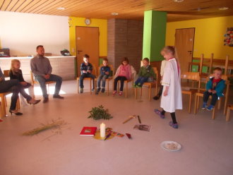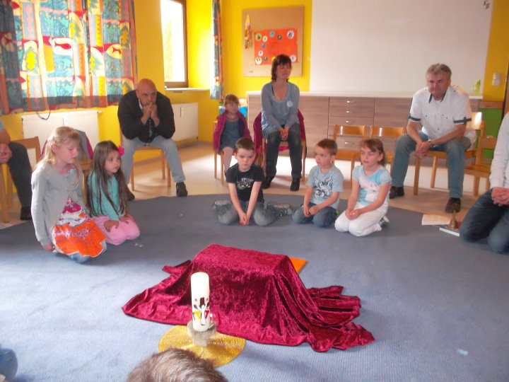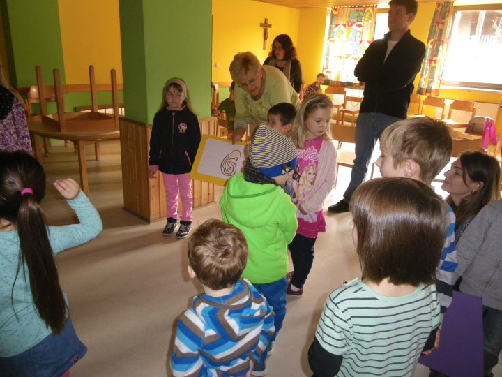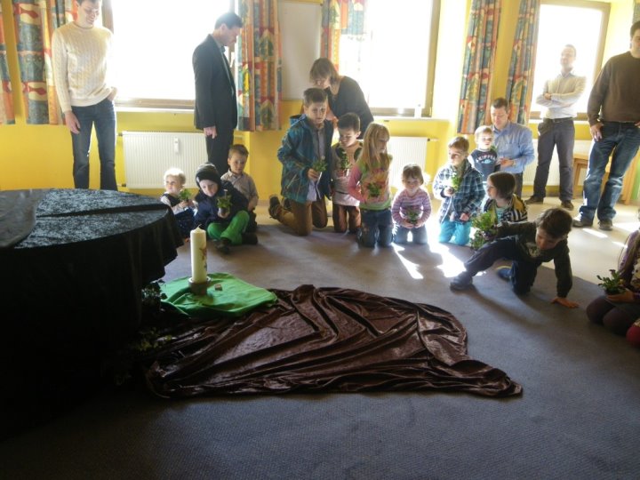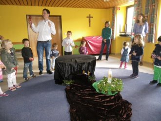 In der Kinderkirche begleiteten wir Jesus am Karfreitag auf seinem Weg zum Kreuzestod. An verschiedenen Stationen mit unterschiedlichen Aktionen und Symbolen erinnerten wir uns an Jesu' letzte Stunden. Zunächst hörten wir vom letzten Abendmahl. Das Brot als besonderes Vermächtnis Jesu' wurde bewusst betrachtet, gebrochen, ausgeteilt und gemeinsam gegessen. Nach diesem Abschied begann der dunkle schwere Weg. Wir durchschritten in schweigend auf schwarzen Tüchern zur Station der Gefangennahme. Die Kinder durften nachempfinden, wie es ist, an Händen gefesselt, gefangen zu sein. Wer wollte, konnte sich die Hände mit kleinen Stricken zusammenbinden lassen. Wir vernahmen aus der Bibel, dass Jesus Angst hatte, aber bereit war, sich dem Willen Gottes zu fügen. Fesseln brauchte man ihn deshalb nicht mehr. Auch wir nahmen uns gegenseitig die Fesseln ab und öffneten die Hände zum Gebet. Am Beginn des Leidensweges erfühlten wir das verdeckte Kreuz. Pantomimisch erlebten wir mit, wie mühsam und schweißtreibend es ist, ein Kreuz zu tragen und wie schwer das wohl auch für Jesus gewesen sein muss. An der nächsten Station begegneten wir daher Veronika, die Jesus ein Tuch reichte. Tücher lagen auch für uns bereit, mit denen wir uns wie Jesus den Schweiß abtupfen durften. Der Kreuzestod war nahe. Die Kinder erspürten die scharfen Spitzen der Nägel. Ergriffen sahen sie zu, wie diese laut und kräftig in das Holzkreuz geschlagen wurden. Danach ward das Kreuz aufgerichtet. Wir versammelten uns stumm darum, stellten eine Grabkerze auf und richteten sein Grab mit Blumen. Im Gebet zum Abschluss waren wir traurig - und hofften.