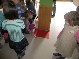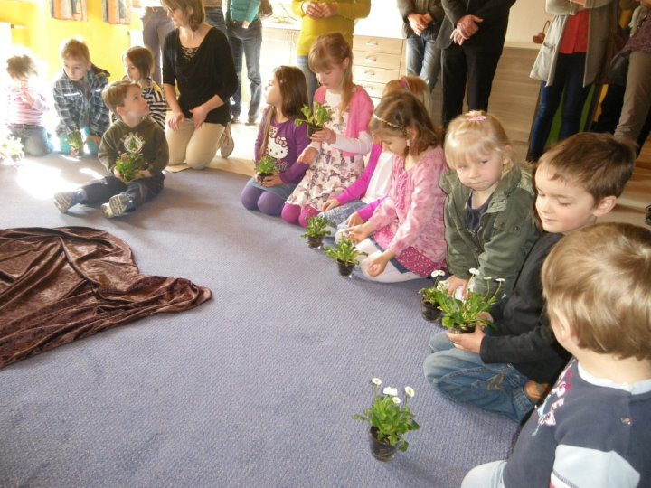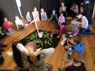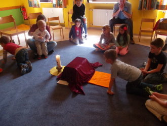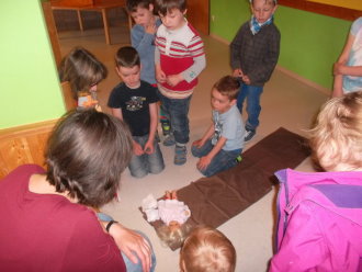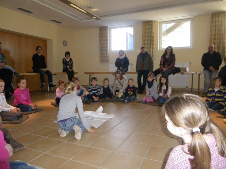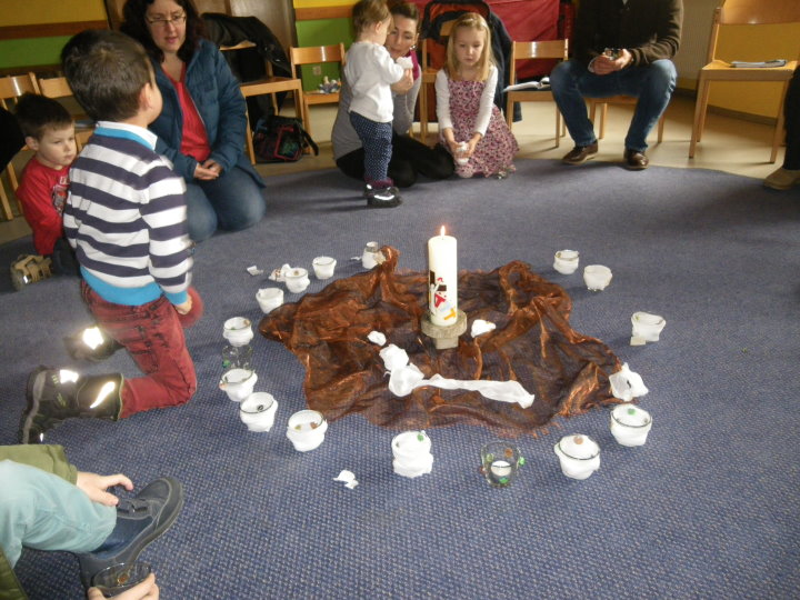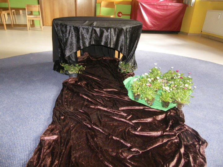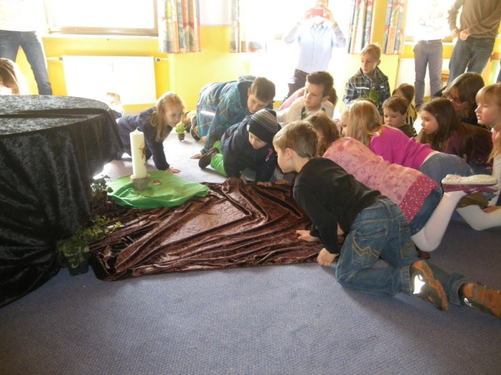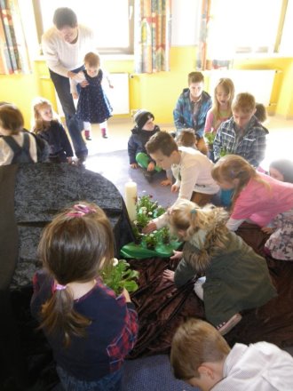 In der Auferstehungsfeier erinnerten wir uns nochmals mit den einzelnen Symbolen, was Jesus am Karfreitag erdulden musste. Wir versammelten uns um das Holzkreuz. Alles war dunkel und traurig - bis drei Frauen sich zum Grab aufmachten. Wir begleiteten sie mit Blumen. Gemeinsam erreichten wir das Grab, welches sich in einem zweiten Raum befand, und betrachteten es. Irgendwie hatte es sich schon ein wenig verändert. Efeu wuchs heraus, die Grabkerze war der Osterkerze gewichen, und vor das Grab war kein Stein mehr gerollt. Vorsichtig lugten wir der Reihe nach hinein, was sich in der Höhle befand. Plötzlich ward unsere Suche von Jemandem unterbrochen. Ein Engel stand vor uns und fragte, wonach wir schauten. Er klärte uns, dass es fürs Traurigsein keinen Grund mehr gibt und wir im Grab nichts mehr finden. Lieber sollten wir uns freuen, dass Jesus lebt und bei Gott sein darf. Als Zeichen dafür entzündete der Engel die Osterkerze. Das Dunkle ist vorbei. Neues Leben blüht auf. Erleichtert gestalteten wir aus der ehemaligen Grabstätte einen blühenden Ostergarten. In einem Oster-Halleluja-Tanz mit klingenden Glocken brachten wir begeistert unsere Freude über das Ostergeschehen zum Ausdruck.