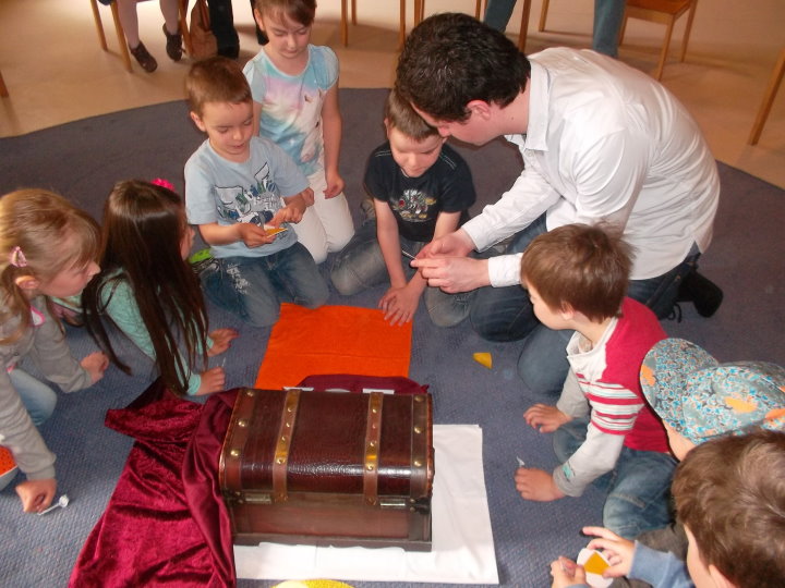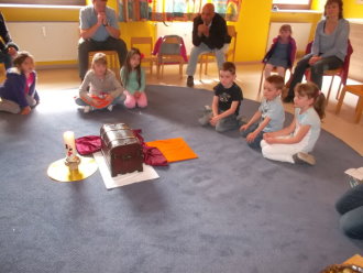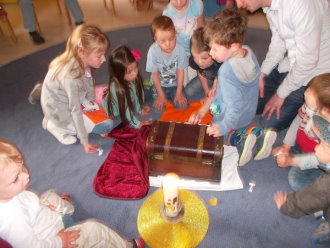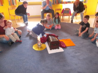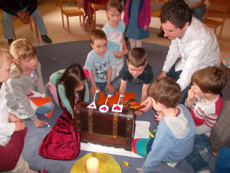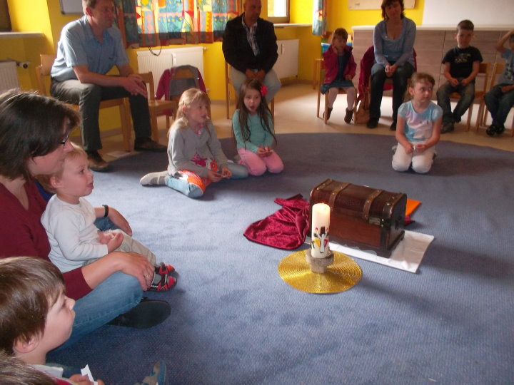 In der Kinderkirche begaben sich die Kinder auf eine besondere Schatzsuche. Sie machten Bekanntschaft mit einem König, den alle seine Edelsteine und Besitztümer langweilten. Ein neuer Schatz musste her - möglichst schnell und bequem. Er rief seinen besten Ratgeber zu sich, wo solch ein Schatz ohne großen Einsatz zu finden sei. Schnell sahen die Kinder mit dem König, dass sich die Schatzkiste schon längst in ihrer Mitte befand. Nur, zu dumm - die Schlüssel fehlten. Da konnte auch der Ratgeber und die Kinder mit ihren mitgebrachten Schlüsseln nicht helfen. Diese passten nicht. Wohl oder über nahm der König den Rat an, sich selbst auf die Suche zu begeben. Unterwegs verband er ein verletztes Kind, goss eine vertrocknete Blume und half einem Schaf, dessen Futter unter Steinen eingeklemmt war. Ärgerlich kehrte er zu seinem Ratgeber zurück. "Überall habe ich gesucht und sogar geholfen, wo es nötig war. Die Schlüssel konnte ich nicht finden. Nur diese Herzen habe ich unter den Steinen, dem Verband und der Gießkanne entdeckt." Gemeinsam mit dem Ratgeber und den Kindern entschlüsselte der König das Geheimnis. Die Herzen passten exakt auf die Türschlösser - und die Kiste sprang auf. Neugierig sah der König hinein und erblickte den Schatz, der ihn auf Dauer glücklich machen kann - Jesus. Die Kinder sammelten eigene gute Taten und bekamen dafür ebenso ein Herz auf ihre Schlüssel. Die Liebe passt auf alle Türschlösser. So fand letztendlich jeder seinen persönlichen Zugang zum wahren Schatz Jesus.