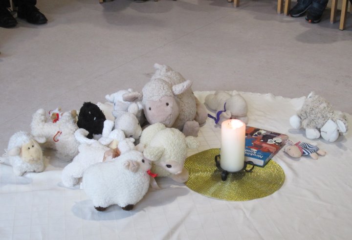 Zu Beginn der Kinderkirche stellte sich dieses Mal die Frage, ob das Bild des Löwen zu Jesus passe. Die Kinder bemerkten, dass ein Löwe zwar stark und mächtig sei, aber mit seinem lauten Gebrüll auch Angst machen könne. Johannes der Täufer, von dem das Evangelium erzählte, bezeichnete Jesus als „Lamm Gottes“. Mit Hilfe eines kuscheligen Stoff-Lammes konnten die Kinder erfahren, dass man vor einem Lamm nicht Angst haben müsse; es sei friedlich und wecke Vertrauen. Als Zeichen, dass wir Jesus vertrauen und zu ihm gehören dürfen, stellte jedes Kind ein kleines Schäfchen zum „Lamm Gottes“.