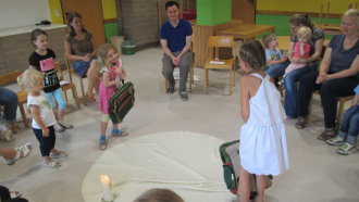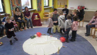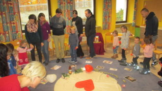 Wie bereitet man sich auf ein Fest vor, zu dem Gott einlädt und von dem wir nicht wissen, wann es beginnt? Mit dieser Frage beschäftigte sich die Kinderkirche am 12. November. Dabei überlegten die Kinder zunächst mit Hilfe einer „Festkiste“, was man denn zu einem „normalen“ Fest so mitnehmen würde: Blumen, Kerzen, Servietten, Luftballons und vieles mehr. Die Bibel erzählte den Kinder von einem besonderen Fest: von Gottes Fest der Liebe. Mithilfe von Bildern entdeckten die Kinder, wie Menschen sich durch einen liebevollen Umgang miteinander auf dieses Fest vorbereiten können.