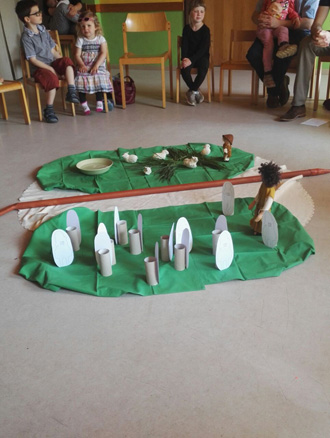 Im Mittelpunkt der Kinderkirche stand am 22. April das Evangelium vom guten Hirten. Zunächst entdeckten die Kinder, dass Schafe so einiges brauchen, damit es ihnen gut geht: Wasser zum Trinken, Gras zum Fressen und vor allem einen guten Hirten, der die Schafe mit seinem Stab gegen wilde Tiere verteidigt und die Herde zusammenhält. Im Evangelium hörten die Kinder von einem ganz besonderen Hirten: von Jesus. Wie ein guter Hirte will Jesus mit uns – seiner Herde – zusammen sein. Und er bleibt auch dann bei uns, wenn es uns nicht gut geht oder wenn jemand gegen uns ist. Als Zeichen dafür, dass wir zu Jesus gehören, durfte jedes Kind eine kleine Figur zum guten Hirten Jesus stellen.
