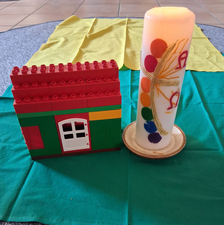 In der Mitte des Sitzkreises war eine Stadt aus Holzbausteinen aufgebaut. Zehn mit Verband umwickelte Teelichtgläser standen für Menschen,