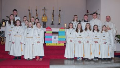 Im Rahmen des Vorabendgottesdienstes zum Christkönigsonntag wurden zwölf Jungen und Mädchen in die Schar der Ministranten aufgenommen. Der Gottesdienst, der vom Jugendchor „Gegenwind“ musikalisch gestaltet wurde, griff als Thema das Mosaikbild auf, das zum Kirchenjubiläum im Oktober erstellt worden war. Im Vorfeld der Aufnahme hatten sich die neuen Ministranten bereits überlegt, wie sie sich als Mosaiksteine in die Pfarrei einbauen lassen wollen. Nachdem Pfarrer Weindl die Neulinge nach ihrer Bereitschaft für den Ministrantendienst gefragt hatte, nahmen die beiden Gruppenleiterinnen Carolin Reichinger und Luisa Rabsilber ihre Schützlinge durch das Umhängen der Plaketten in die Ministrantenrunde auf.