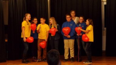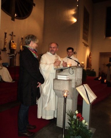 Auch die „Ministranten-Mama“ Cordula Schäfer nahm an diesem Abend als Leiterin der Sprecherrunde Abschied. Pfarrer Weindl überreichte ihr als Dankeschön für ihren großartigen Einsatz einen Wellness-Gutschein und ein symbolisches Geschenk: eine Glasvase mit einer Kerze. Durch ihren Dienst als Ministrantenleiterin sei sie in besonderer Weise „Licht der Welt“ gewesen, sagte Pastoralreferent Hirschberger mit Blick auf das Thema der Aufnahmefeier. Durch ihren unermüdlichen Einsatz habe sie unzählige Ministranten zum „Leuchten“ gebracht. Beim anschließenden bunten Abend, der voll war von Sketchen der Ministranten und lustigen Spielen, verabschiedete sich auch die Sprecherrunde mit einem großen Blumengesteck, einem selbst gemachten Film und einem Lied von ihrer langjährigen Leiterin.
