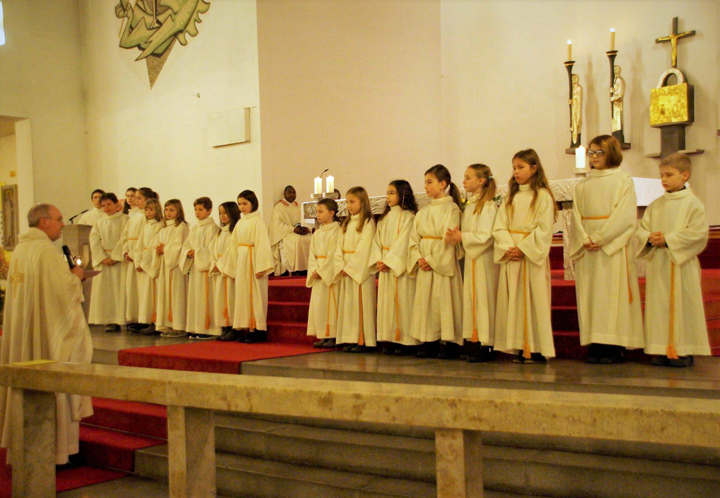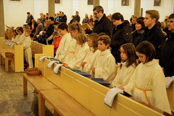 Am Samstag des Christkönigsfestes wurden elf Mädchen und ein Junge in die Gemeinschaft der Ministranten von St. Michael aufgenommen. Seit Wochen hatte sich diese mit ihren Gruppenleitern Michael Sperger, Stefan Geck, Kathrin Smarzoch und Laura Piwonka auf den Tag der Aufnahme vorbereitet. Die neuen Ministrantinnen und Ministranten sind:
